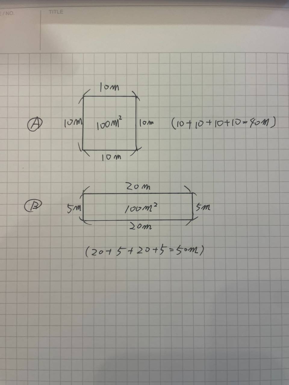 しかし、面積は同じでも「家の周囲の長さ」が全然違います。