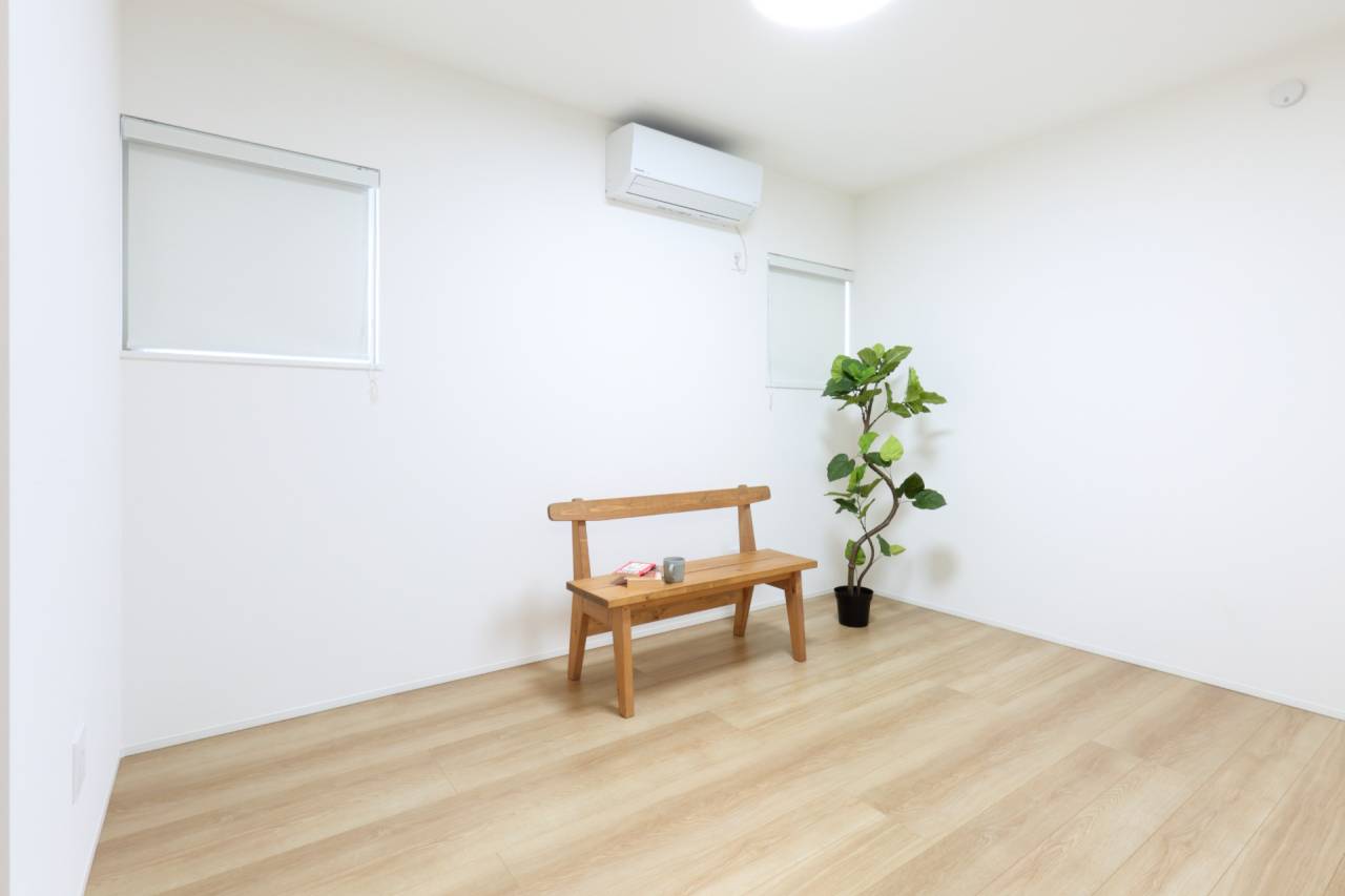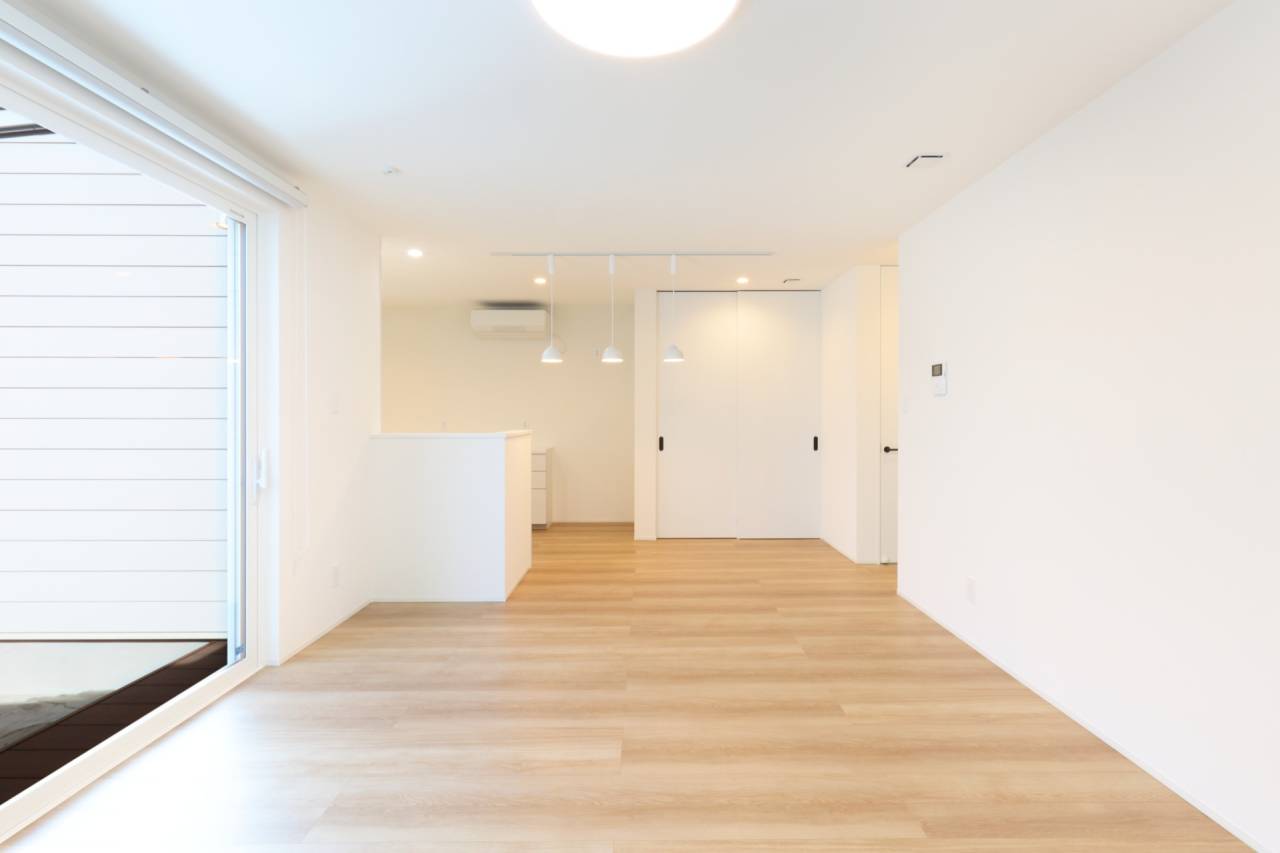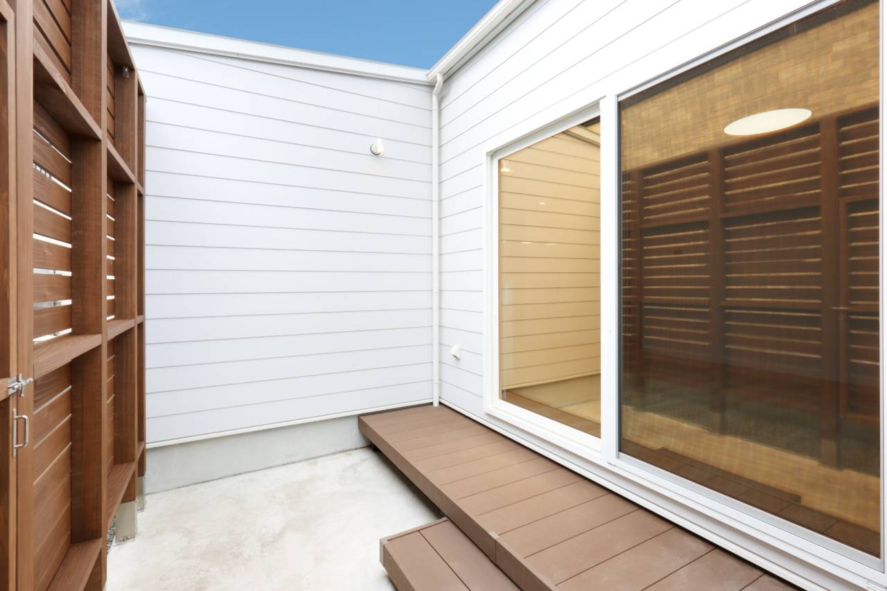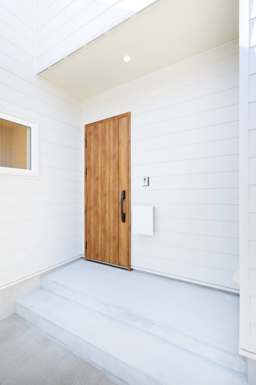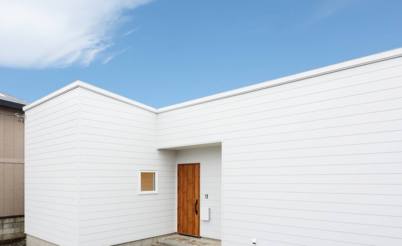 横方向のラインが美しい純白のサイディングに、木目が際立つドアをアクセント。一切の窓を排除したファサードは、防犯性を極限まで高めると同時に、雨だれによる汚れを寄せ付けず、新築時の美しさを長く守り抜きます。