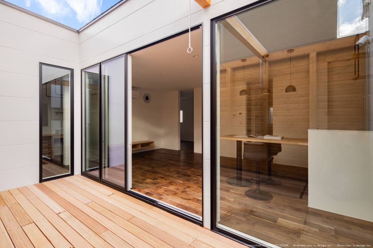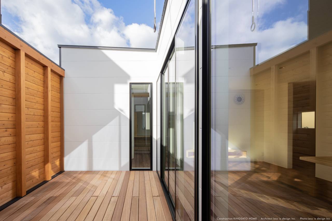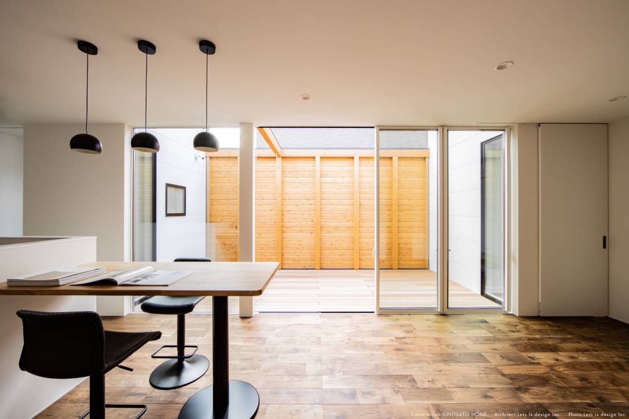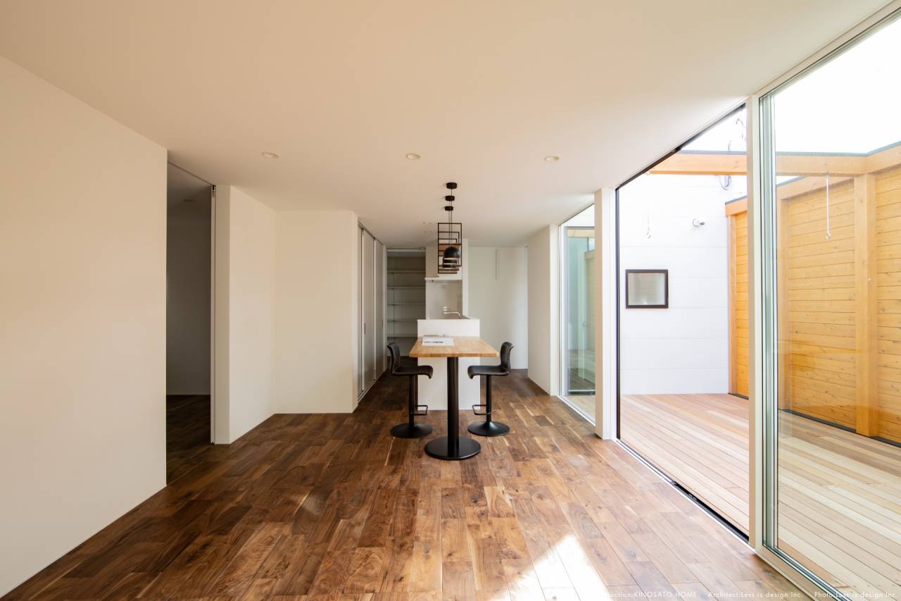 リビングとフラットに繋がる中庭は、高い目隠し壁に守られた「屋根のないリビング」です。カーテンを一切必要としないこの空間では、外壁に反射した柔らかな光が室内を満たし、24時間、視線から解放された自由な時間を楽しめます。ウォルナット調の床がもたらす「静寂」