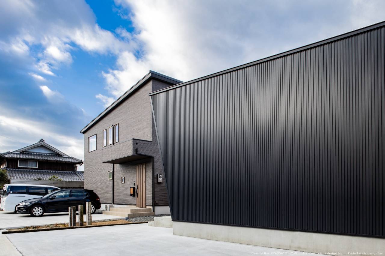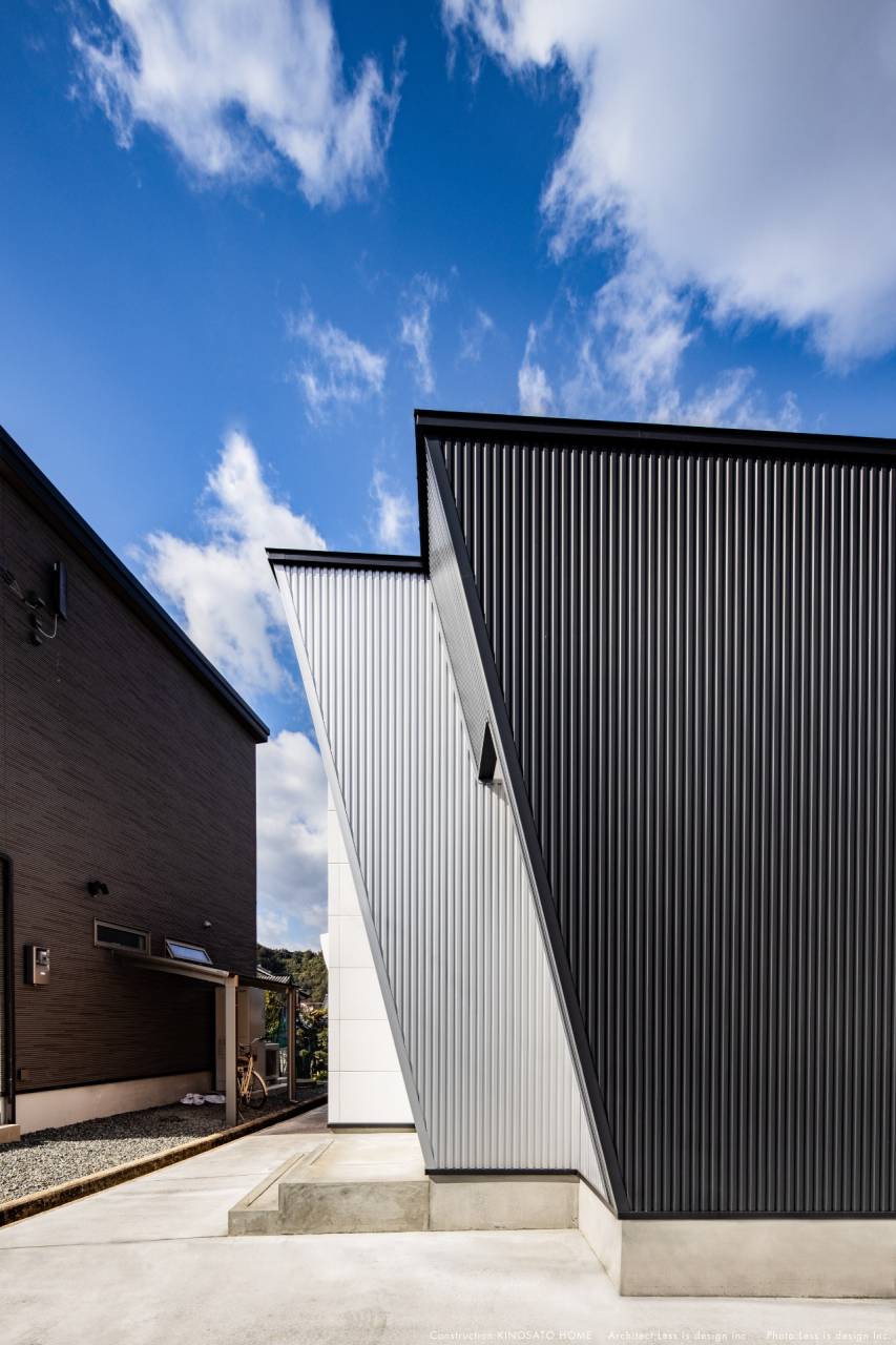 まず目を引くのは、漆黒のガルバリウムと純白(シルバー)の外壁が織りなす大胆なコントラストです。このシャープな造形には、家を守り、街を彩るためのロジックが込められています。
