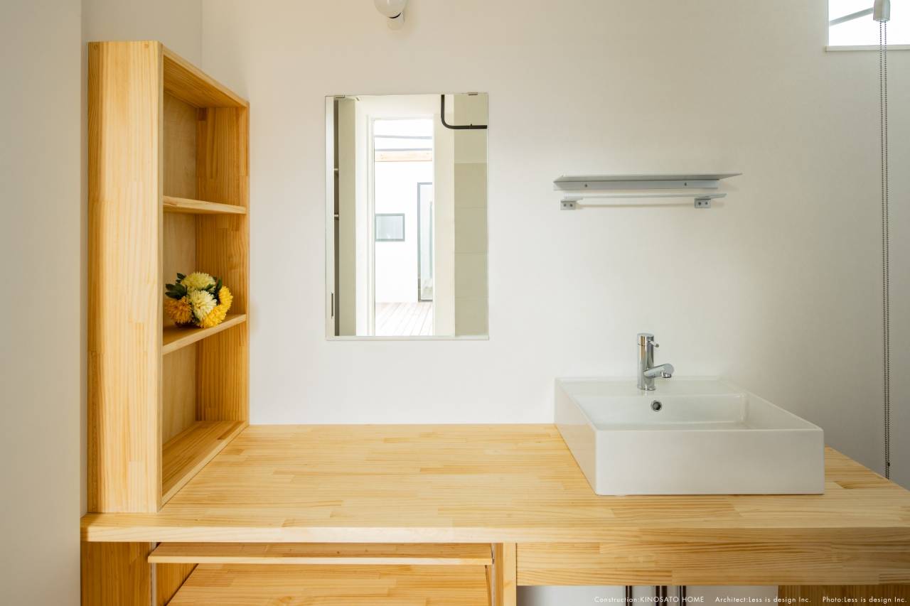 天然木のカウンターにスクエアなシンクを合わせた、ミニマルな洗面スペース。余計なものを置かない、それでいて必要な場所に必要な収納がある、SIMPLE NOTEらしい機能美が光ります。家事動線をデザインする キッチンからリビング、そして中庭へと抜ける視界。家事をしながらでも家族の気配を感じ、開放感を味わえる設計は、忙しい日常に心のゆとりをもたらします。