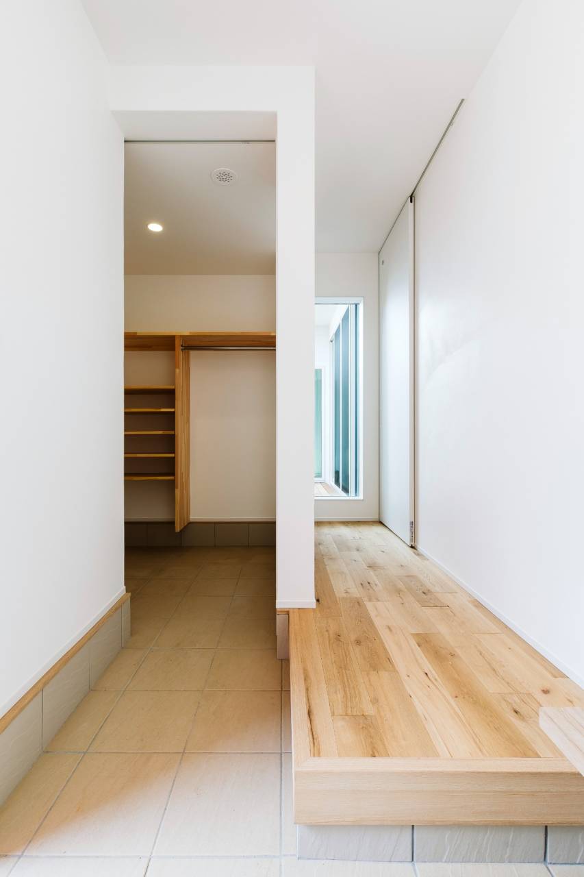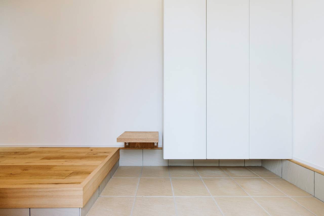 道路側には、生活感を感じさせる大きな窓を一切設けていません。木目のアクセント壁が玄関周りに温かみを添えつつ、外部からの視線を物理的にブロック。住宅街にありながら、家族のプライベートを死守するSIMPLE NOTEらしい設計です。汚れを未然に防ぐ「窓なし」のメリット