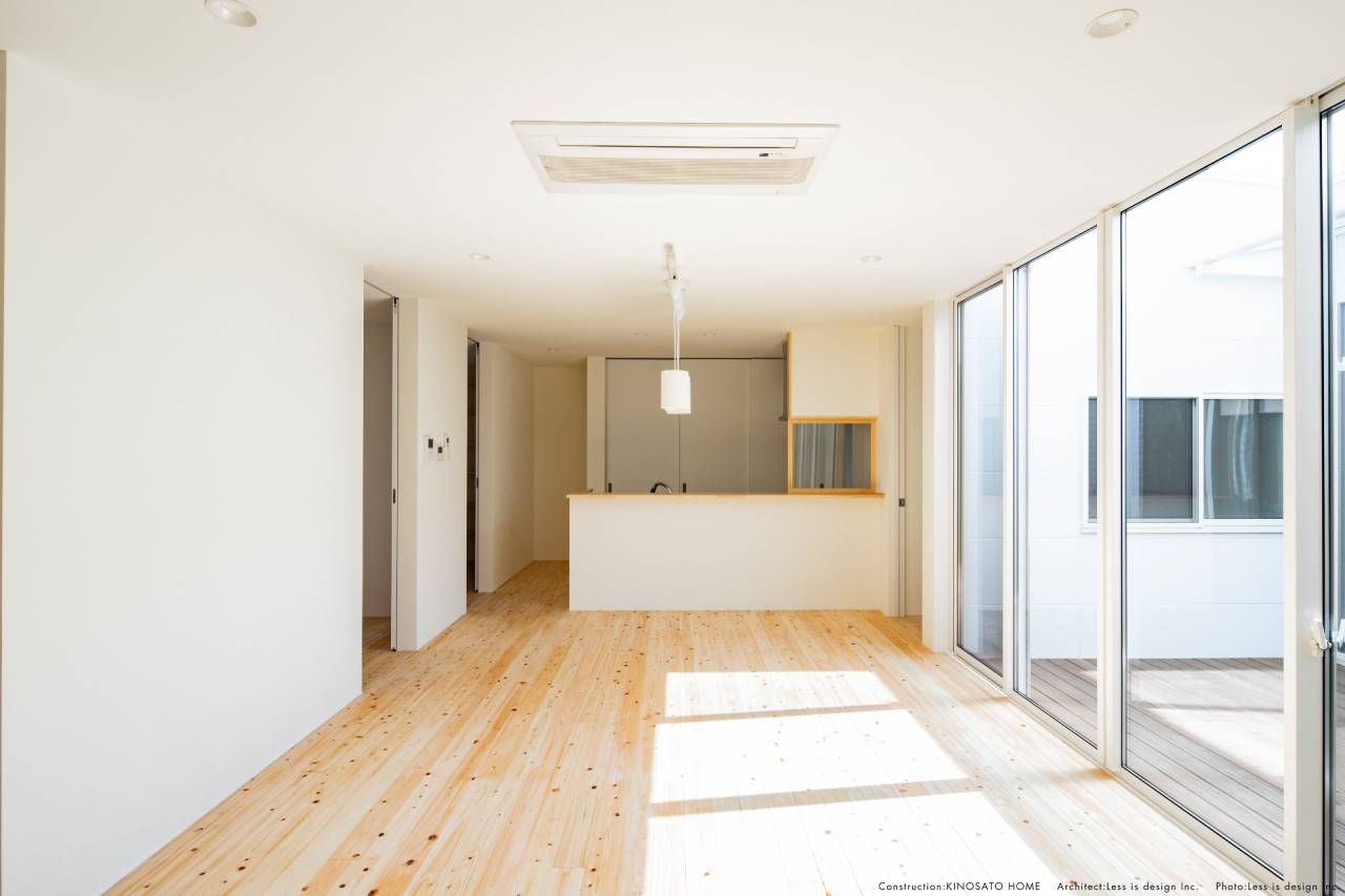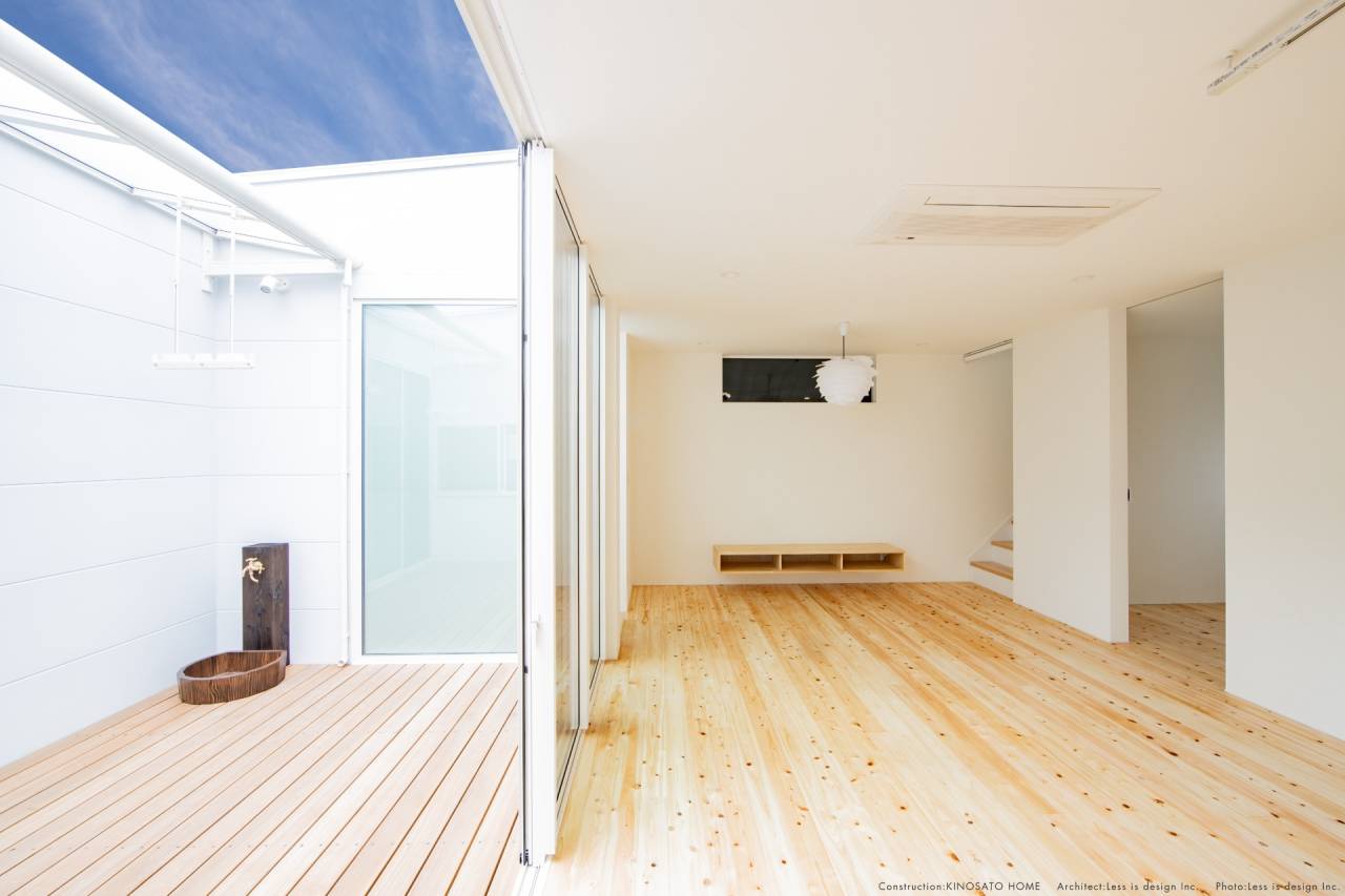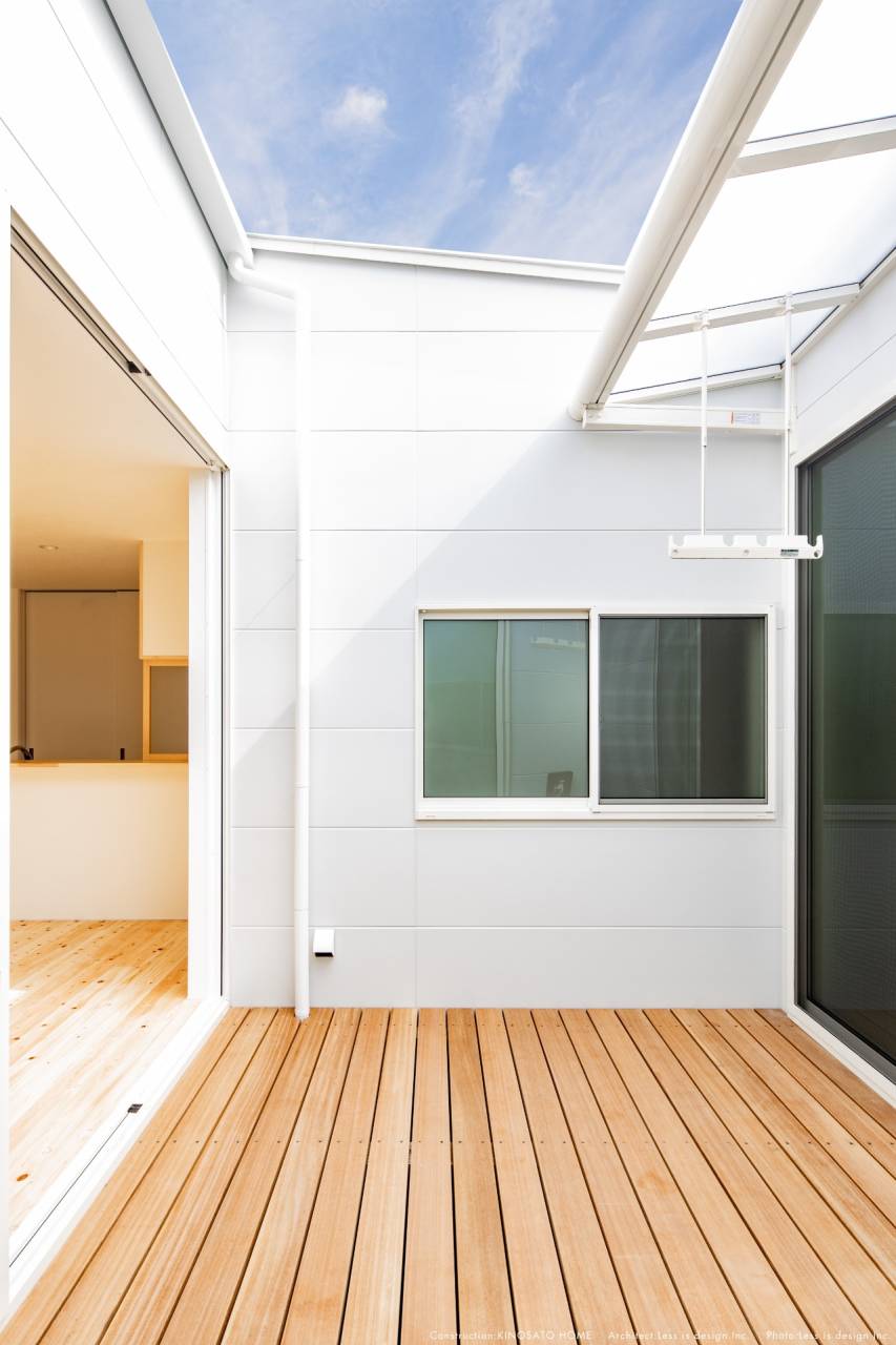 リビングからフラットに続くウッドデッキは、室内と屋外の境界を曖昧にします。お茶を楽しんだり、お子様が遊んだりと、家族だけの「切り取られた空」を独り占めできる贅沢な場所です。
