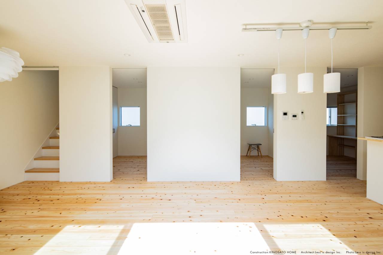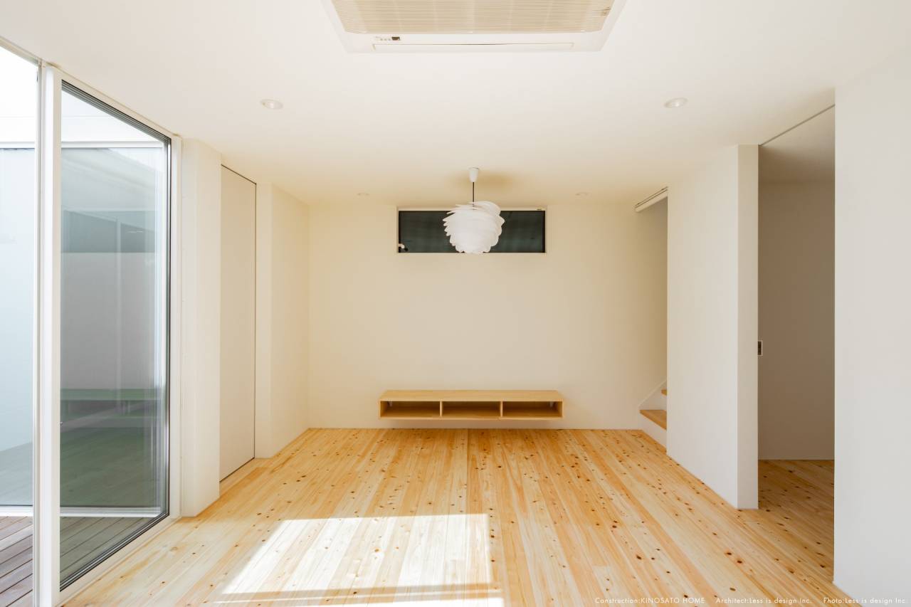 L字型に配された大開口の窓が、中庭を囲むように配置されています。中庭の白い壁に反射した柔らかな光が室内へ跳ね返り、直射日光ではない「質の高い明るさ」を家中へ届けます。カーテンのいらない開放感